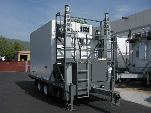 A trailer with a horizontal mast, which pivots into a vertical position when deployed. Typically used with outdoor equipment, but can be designed to accommodate an enclosure. The standard mast height is 60'(mast heights of 100' and 150' are also available as options). Its heavy duty hydraulically-operated design will not only lift a massive 1200 lbs., but will support mid-mast deployments, unlike pneumatic masts. Features include (partial list):
