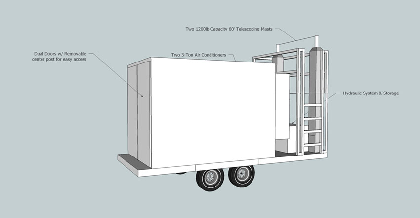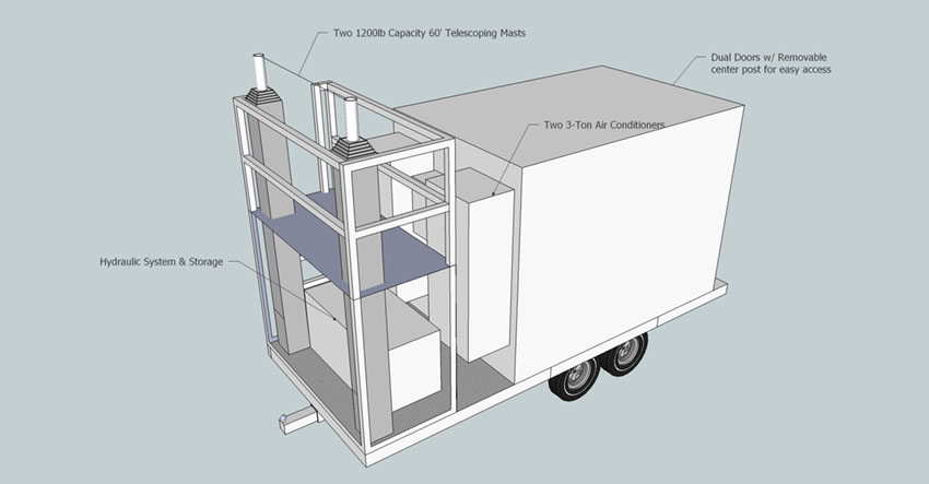 A heavy duty trailer designed for vertical masts; it can be used either with outdoor equipment or indoor equipment when